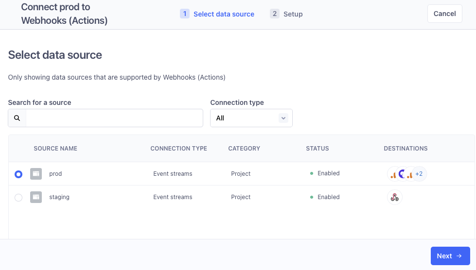 Choose the relevant data source whose events you want to utilize in Aggregations.io.