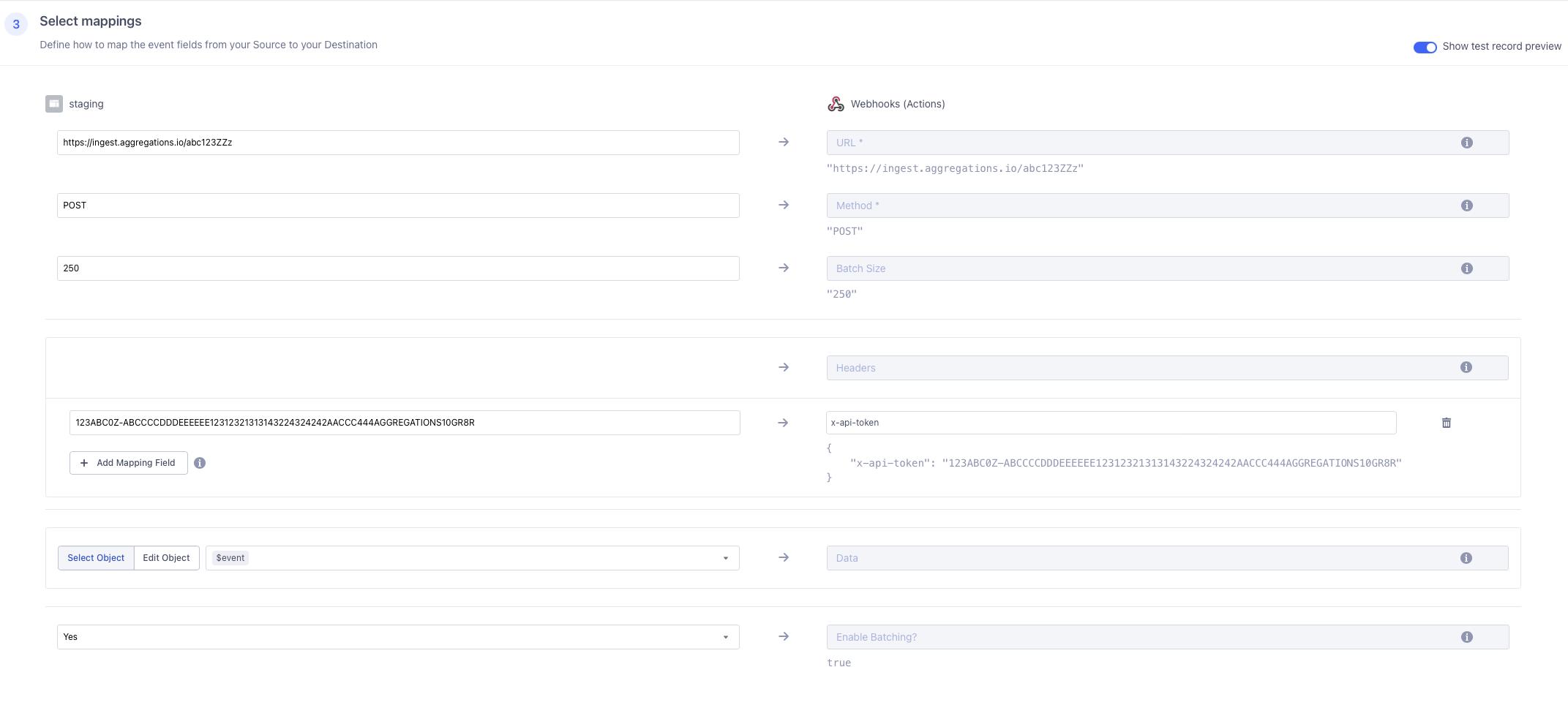 URLshould be yourPOST URL(something likehttps://ingest.aggregations.io/[ID])Methodshould bePOSTBatch Sizeshould be ~ 250. Depending on the average size of your payload, you may want to increase or decrease this to ensure your payloads are not too large. Check out the Ingest API limits.- Inside