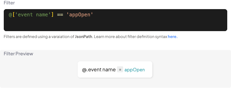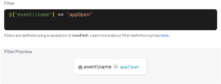 JSONPath is a query language for JSON, often shortened to "JPath". Aggregations.io uses a simplified variation of JPath for filtering events and addressing individual properties.