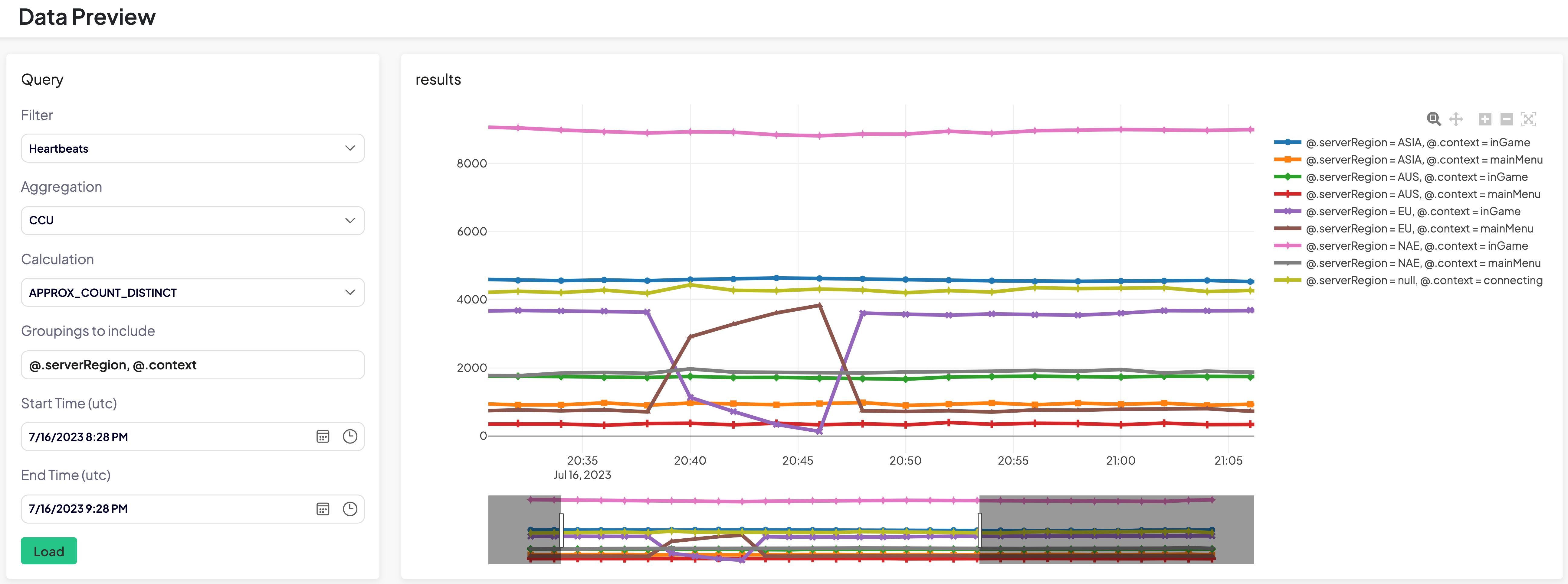 The Data Preview allows you to see the results for one of your aggregations by choosing a Filter and Aggregation to plot over a selected start and end time. You can also choose to include or exclude groupings in the preview. When including groupings, you can toggle an individual group by clicking on it in the key. Double-click to quickly isolate one group.