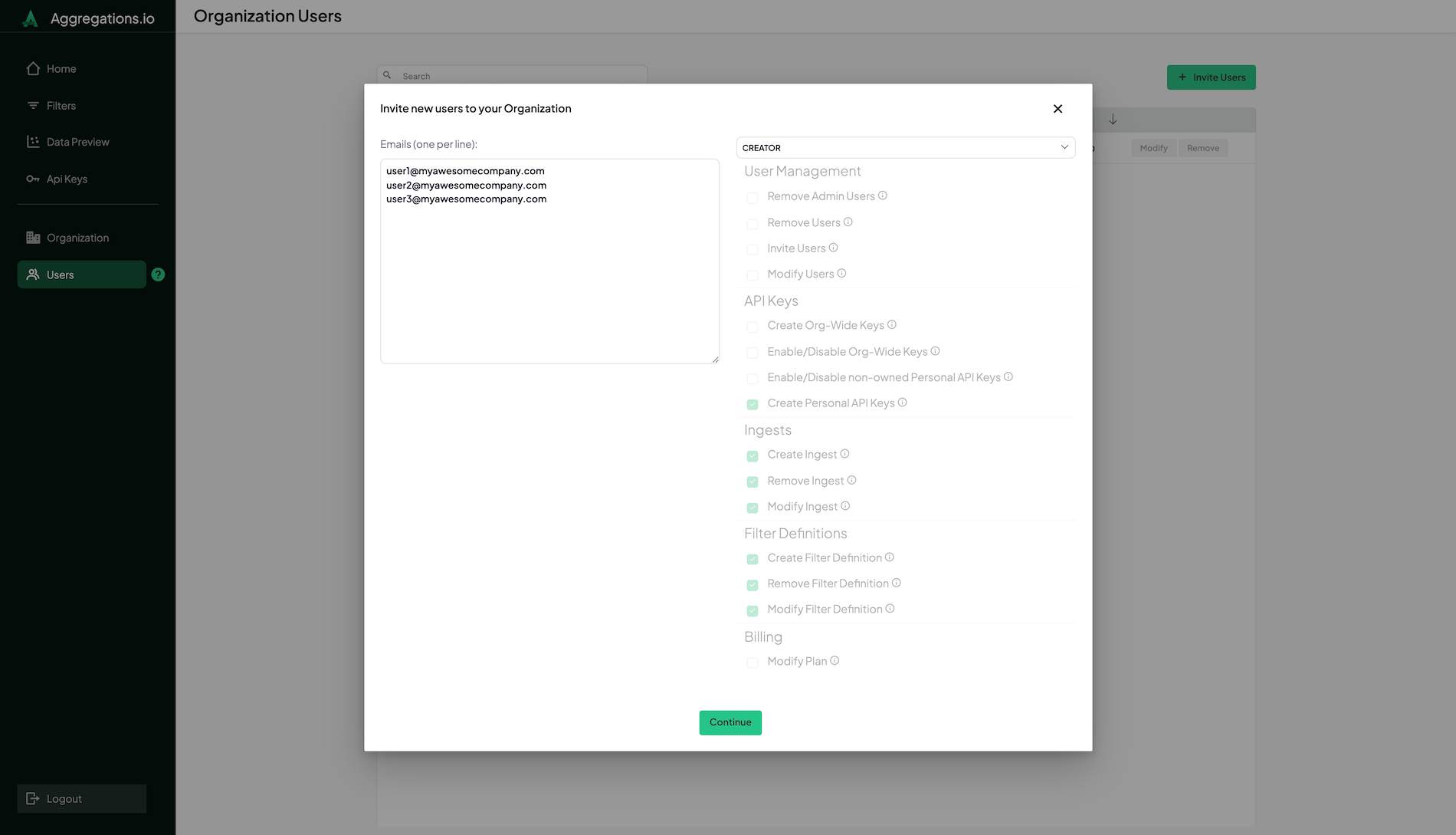 To add new users, select the + Invite Users button on the Users page. Aggregations.io allows you to have as many users as you need. To bulk-add new users with the same permissions roles, add one email per line. Each invited user will get a link to sign up and create an account. As soon as they verify their email, they'll be able to accept your invitation.