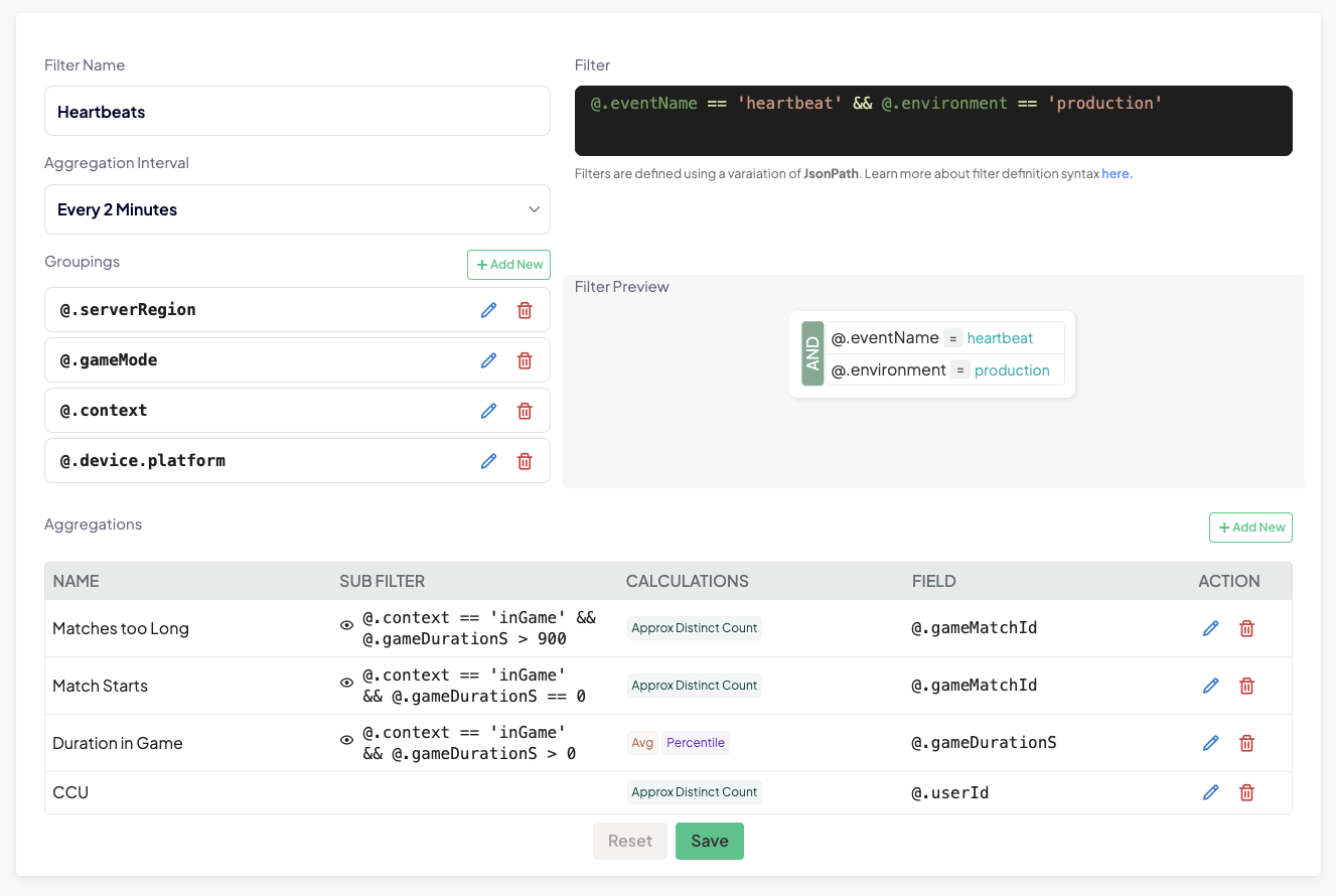 From this one event, we'll be able to observe in near real-time the behaviors of our players and monitor for changes that may indicate more systemic problems. We didn't even go over the use of the various other aggregations we're able to achieve. The heartbeat also has tremendous value in batch/warehouse analytics. If there's one event to get implemented into your product and analyzing in real-time with Aggregations.io -- it's a heartbeat.
