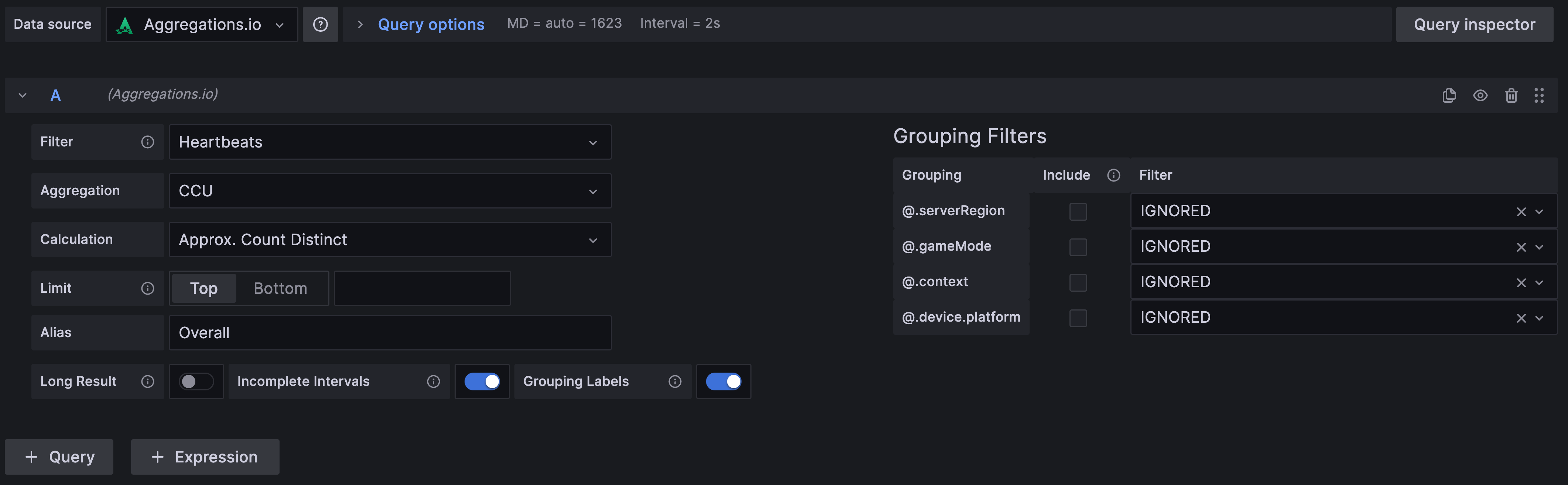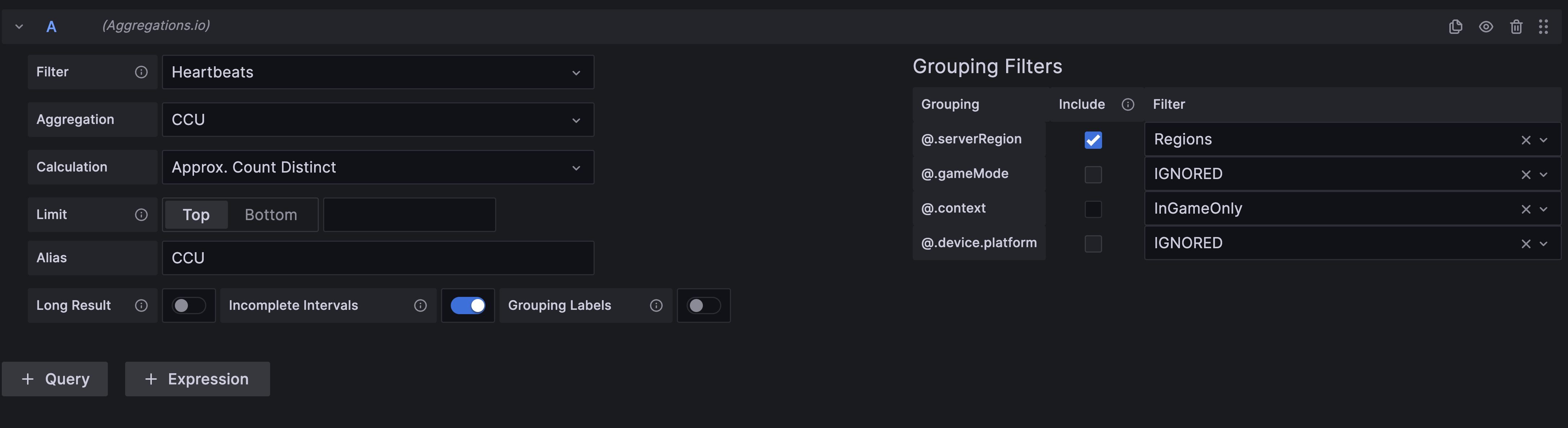 We start by adding a panel for overall CCU, selecting our newly created Heartbeats filter and the CCU aggregation. Since we want this first graph to be high level, we set our groupings to IGNORED.