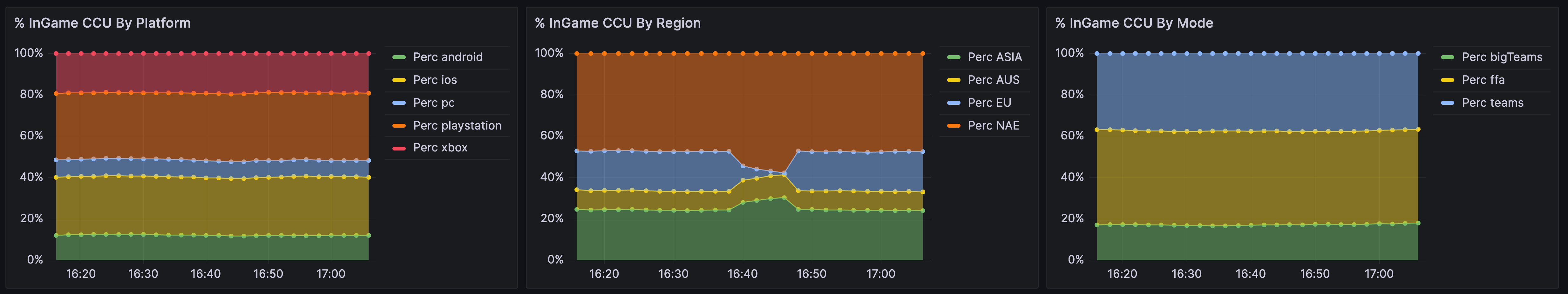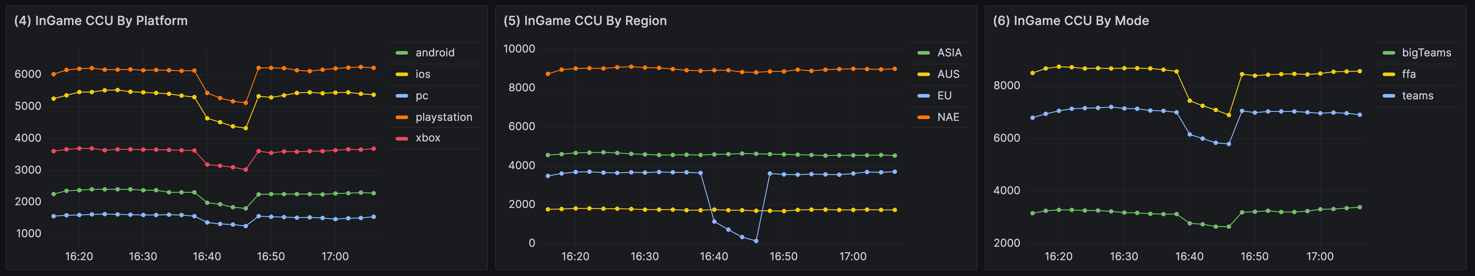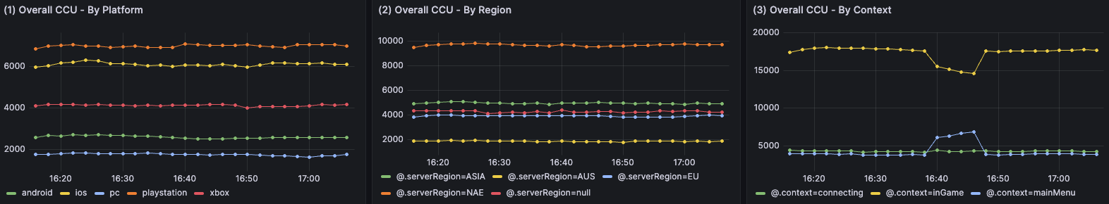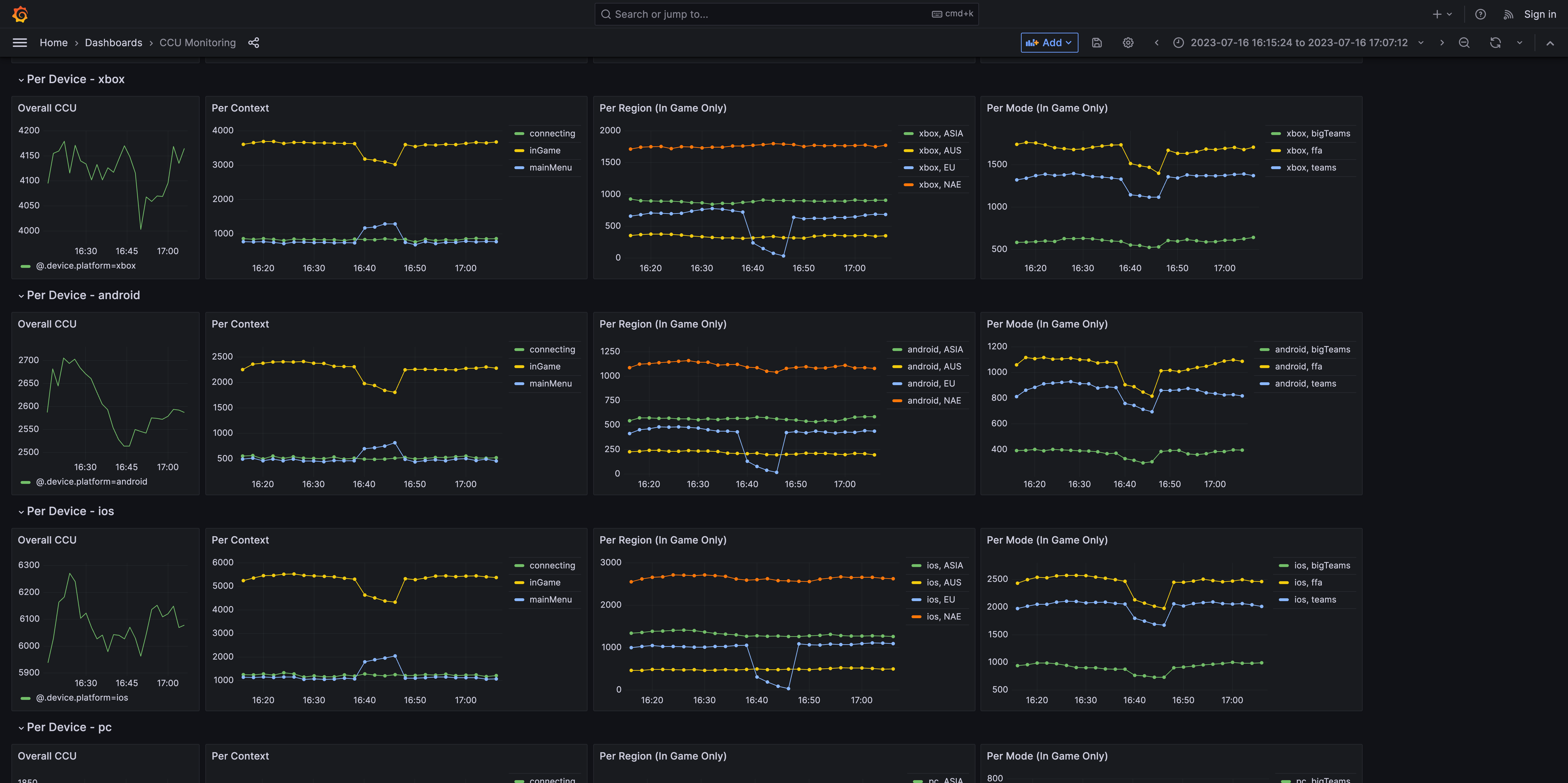 We're setting up breakdowns for high level monitoring of CCU by (1) Device Platform, (2) Region, (3) Context. We also want to monitor in-game CCU by (4) Device Platform, (5) Region (6) Game Mode.